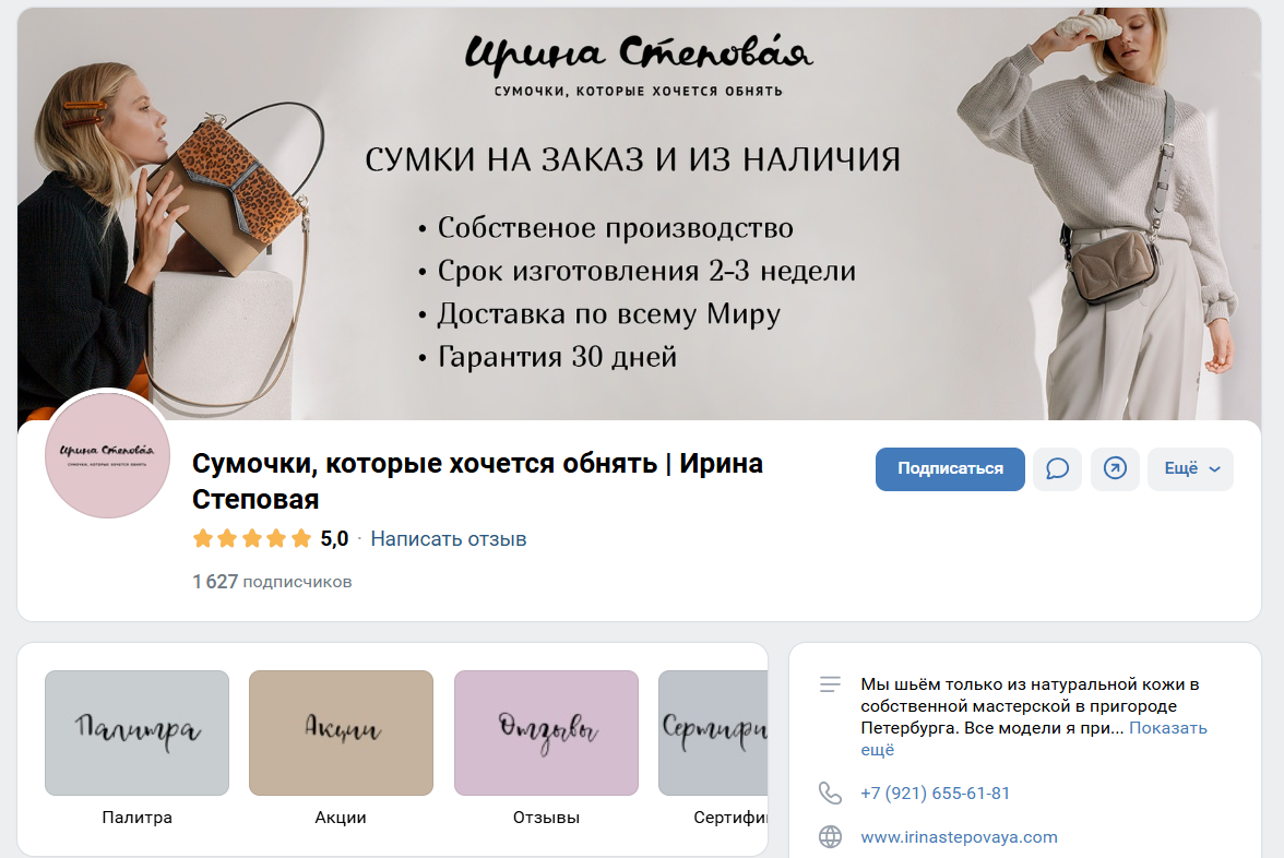 https://vk.com/irinastepovayabags — бренд сумок, рюкзаков и аксессуаров из натуральной кожи на заказ и из наличия с доставкой по всей России.