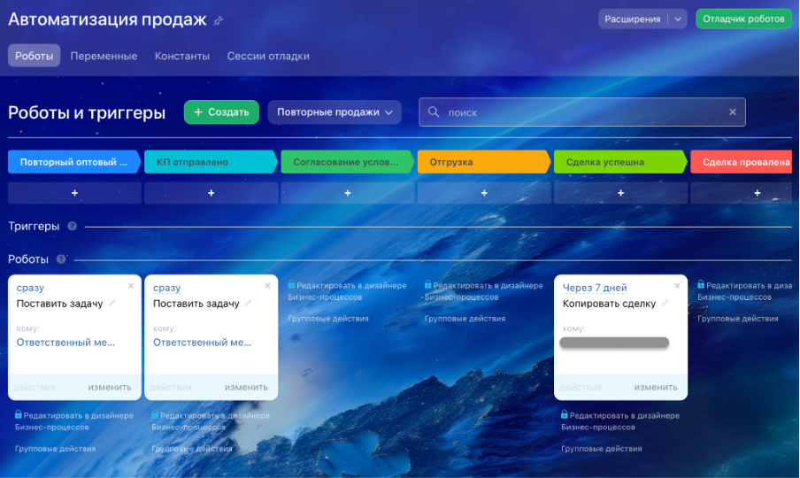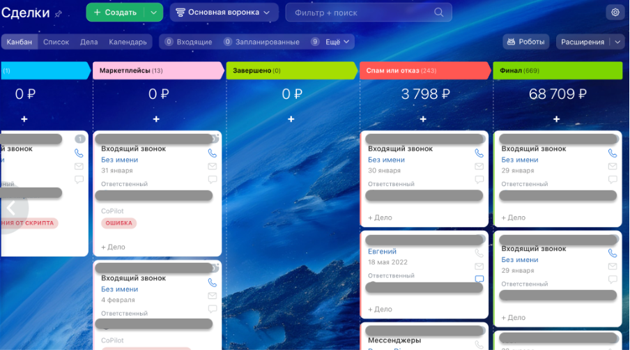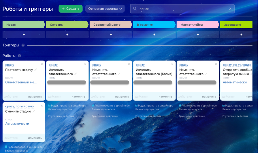• заявки сразу распределяются по нужным воронкам и ответственным.